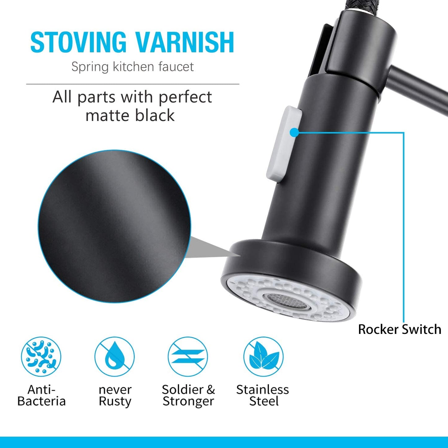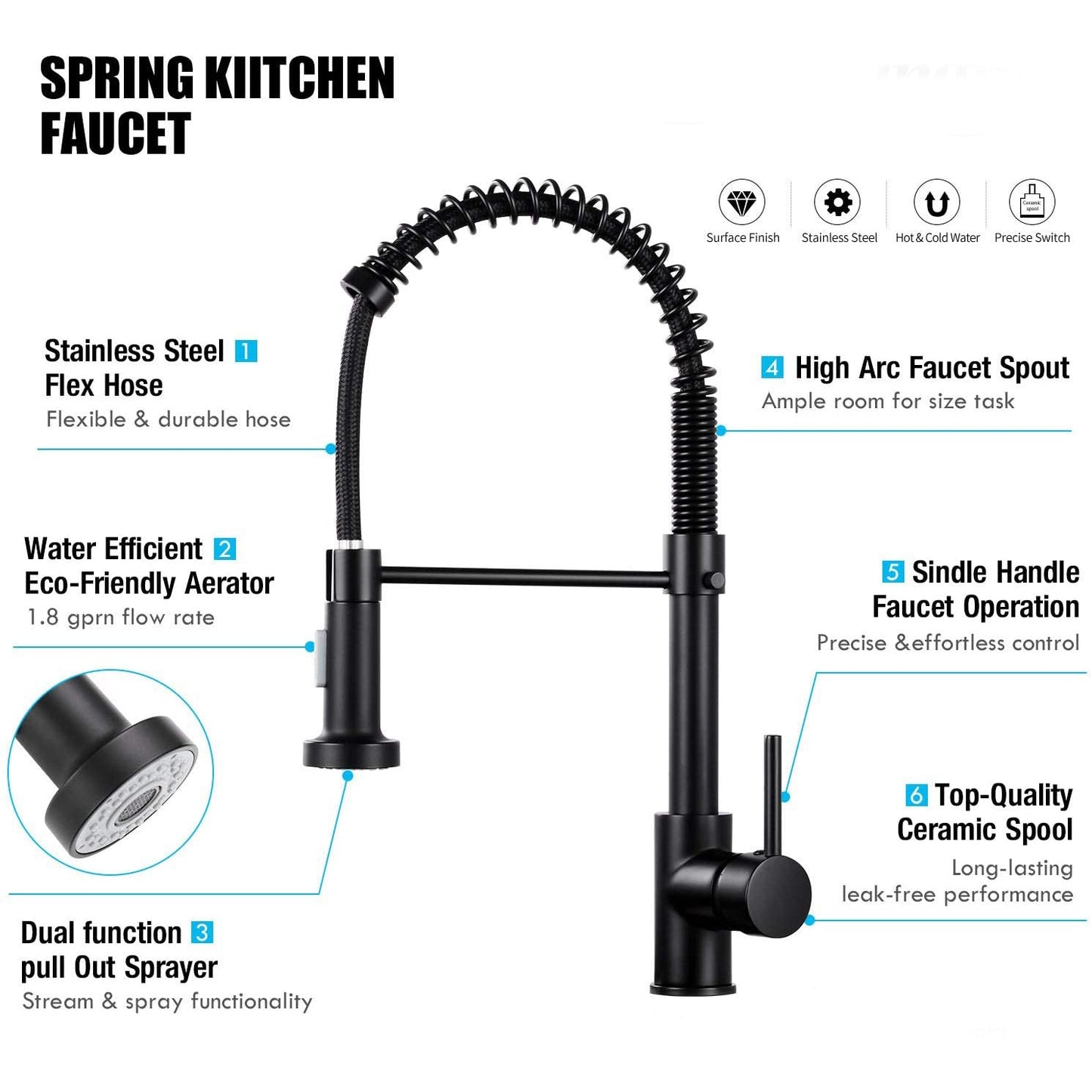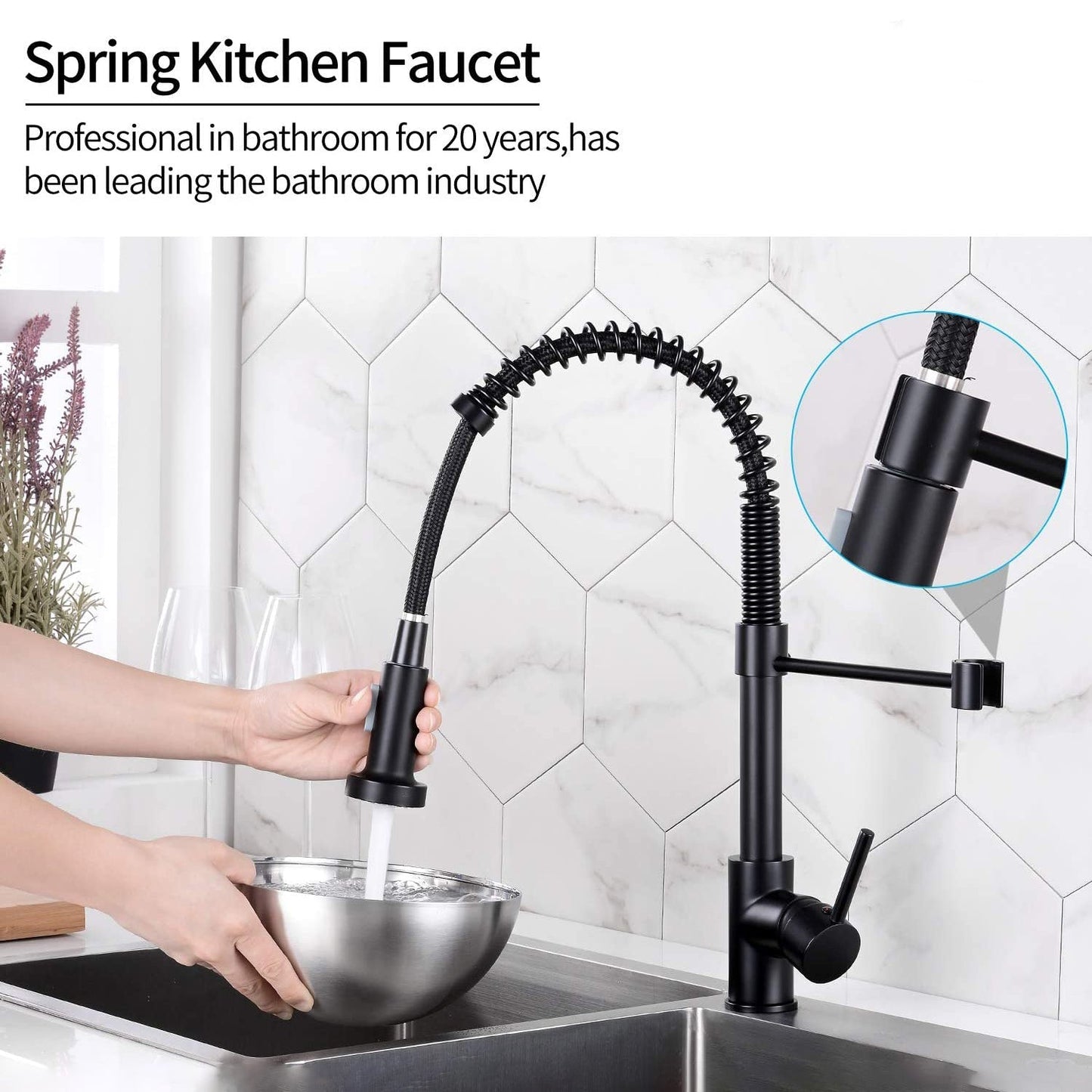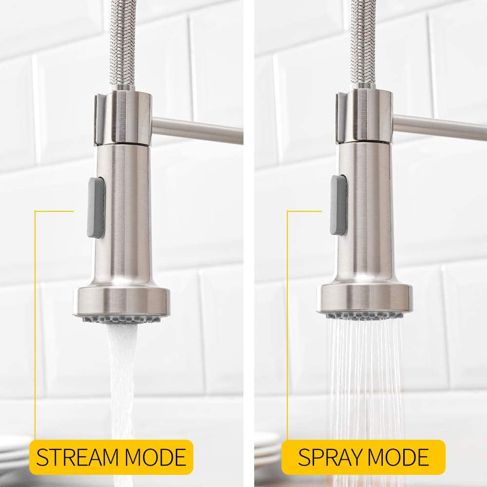 Commercial-style sleek spring design makes your kitchen simple and fresh. Powerful dual-function spray and stream pull down kitchen faucet.