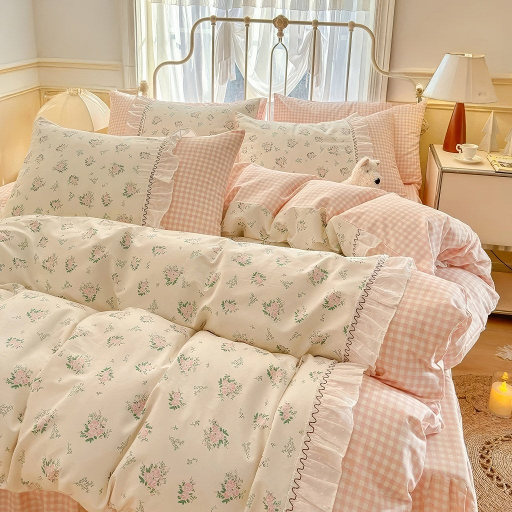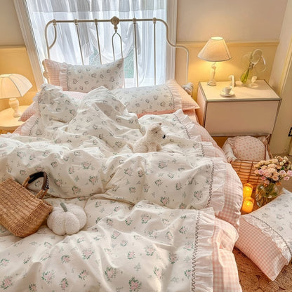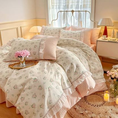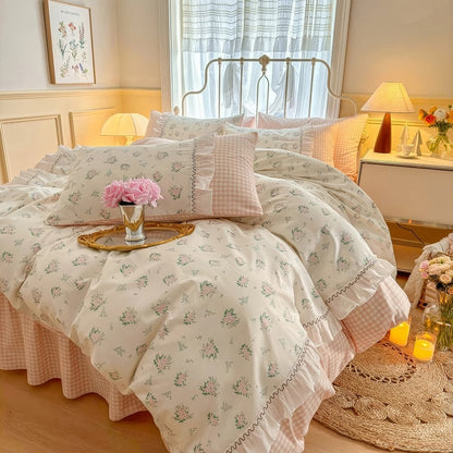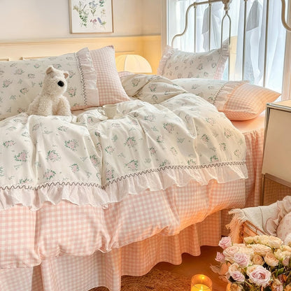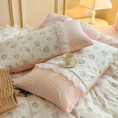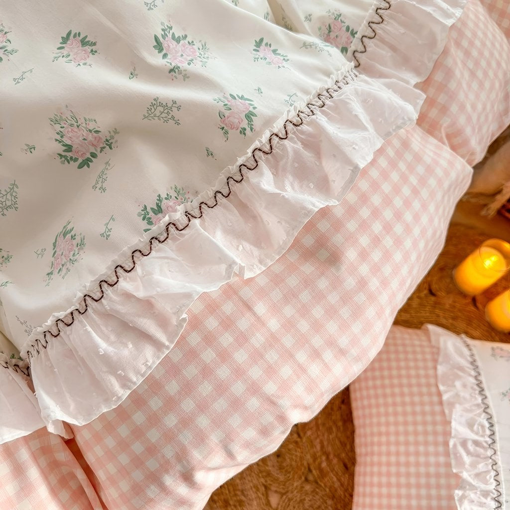 Shop the Kawaii grandma style pastel gingham plaid print bedding set sewn with lush ruffle laces, perfect for a soft, cozy, cottage-style aesthetic. Its vintage-inspired cottagecore pattern and white ruffle laces will blend perfectly in both kawaii and cottagecore inspired bedrooms. The lightweight fabric is breathable and ideal for year-round comfort.
