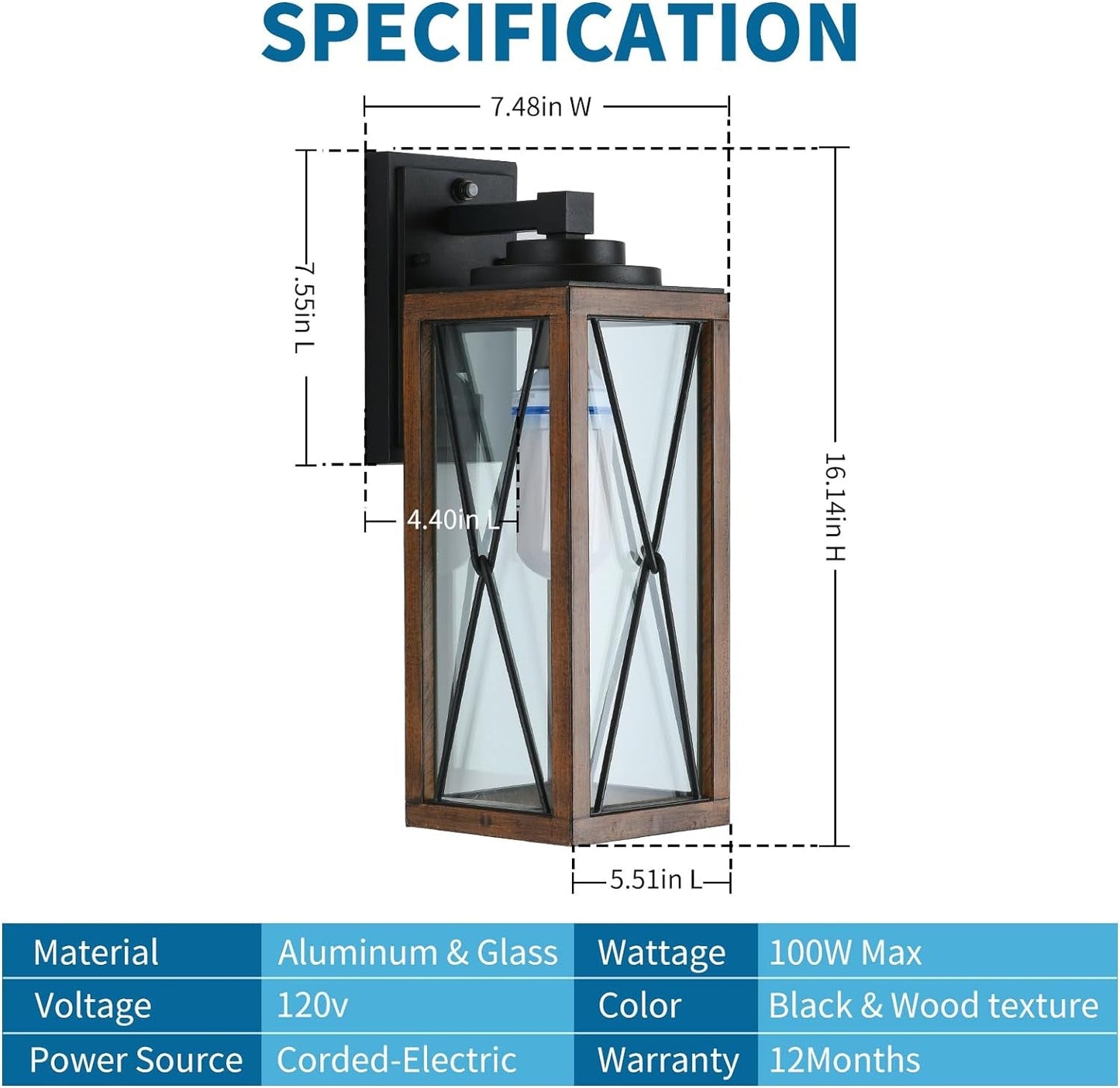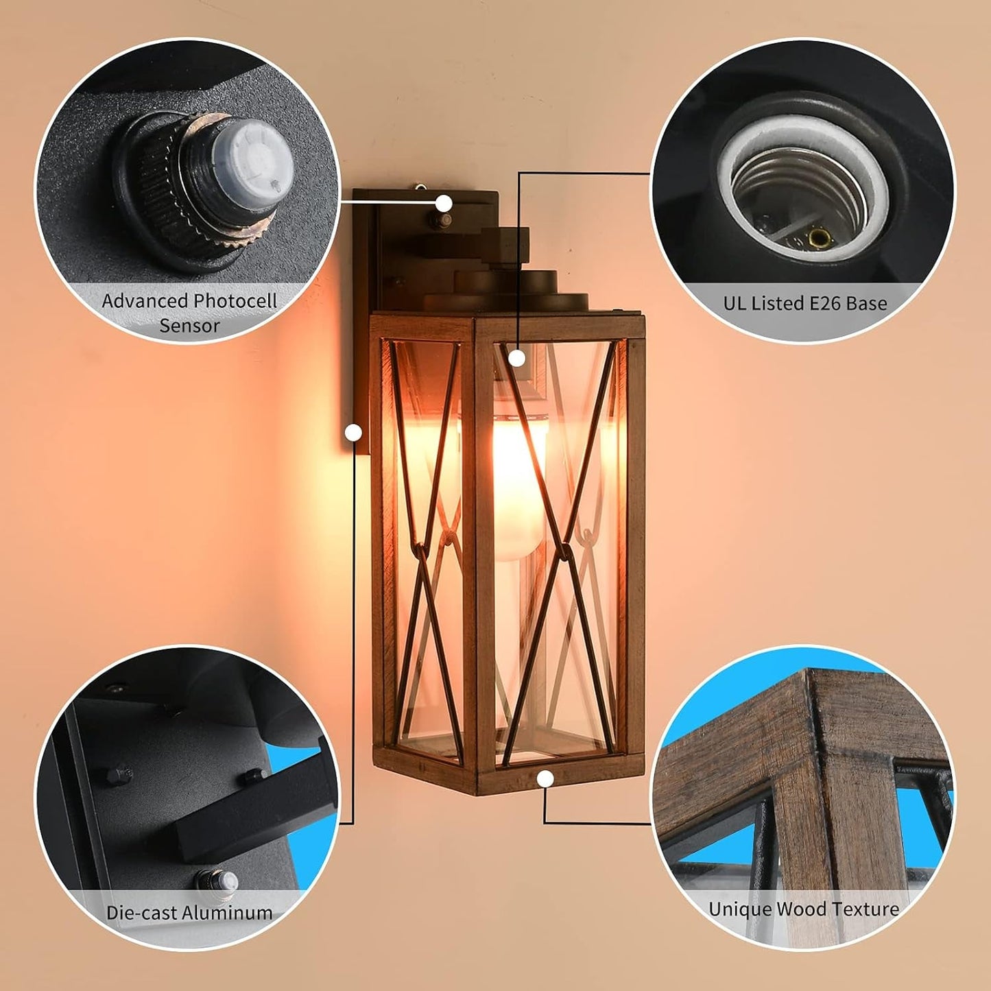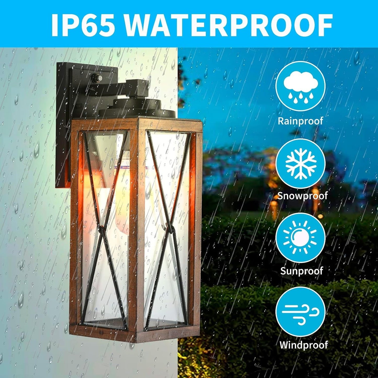 Outdoor Weather ResistantThe wall light uses thickened aluminum as the main material, and has passed IP65 waterproof test, corrosion resistance and rustproof. | Outdoor Professional CoatingsThe outdoor wall lamp uses outdoor paint with wooden texture to create a sense of mystery, and it has super adhesion, which can effectively prevent the erosion of acid rain. | UL/ETL listed for safetyThe outdoor wall lamp has passed the ETL certification, and the E26 socket is listed by UL, which can effectively reduce the consumption of the bulb (excluding the bulb) |