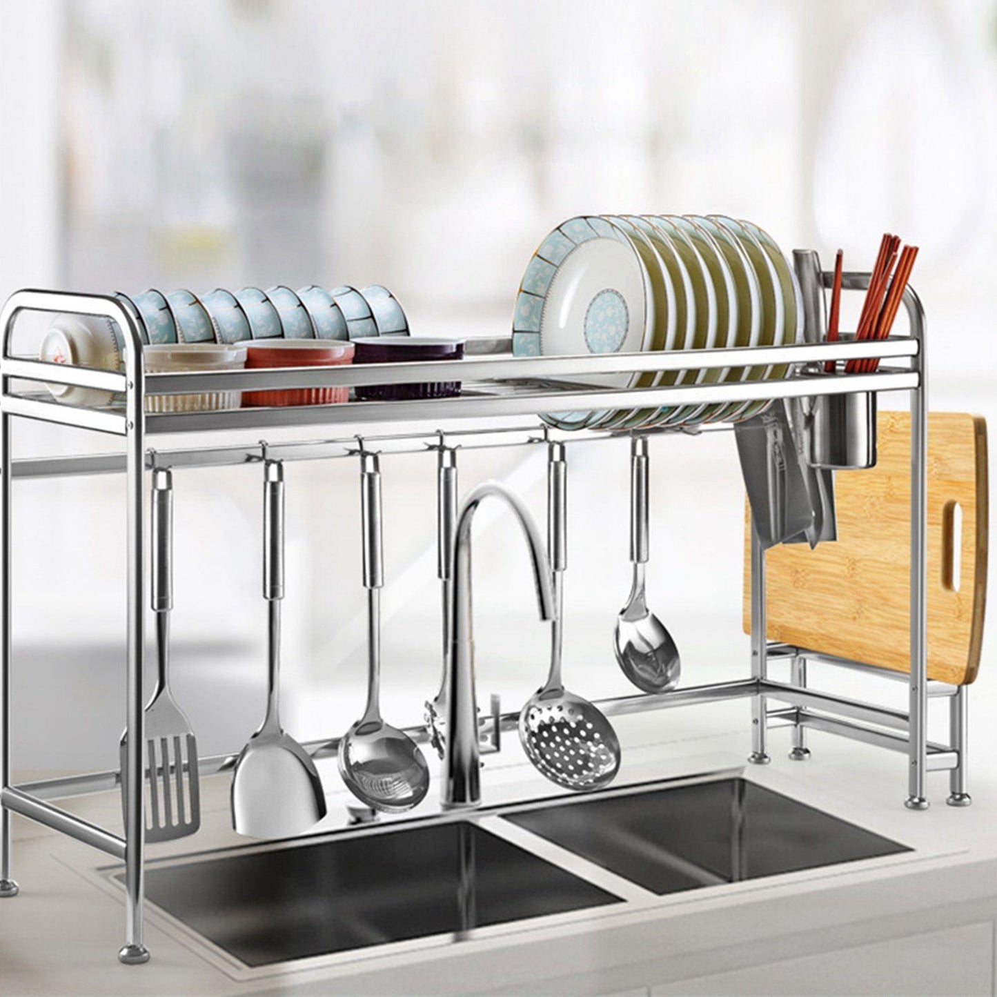 Our dish rack is a good kitchen helper to organize your dishes, cups, bowls, chopping board, seasoning bottle, cook ladle, cutleries, keeping your kitchen tidy and clean. Adopts 6 hooks and cutlery holder with drain hole design, keep your utensils dry and convenient to store. 110LBS max load and make full use of vertical space above the sink.