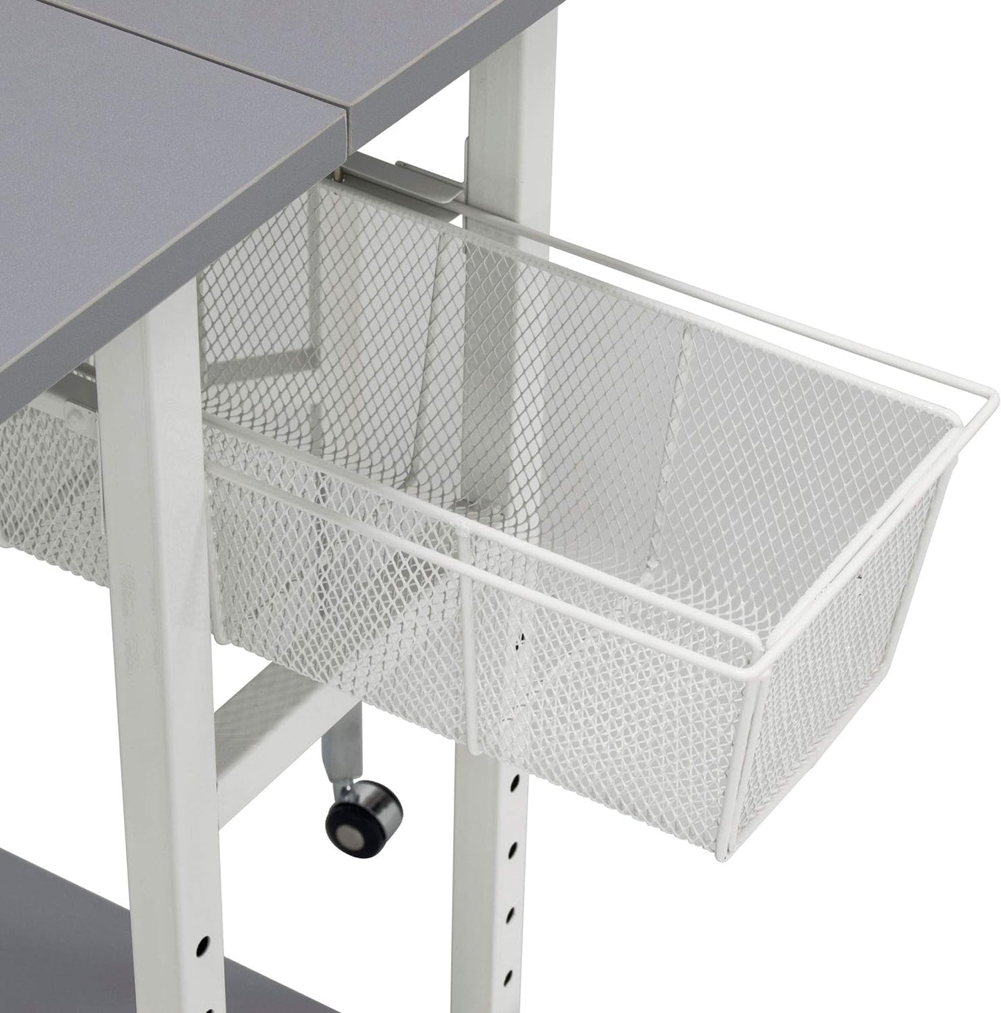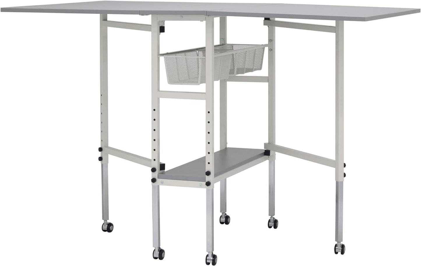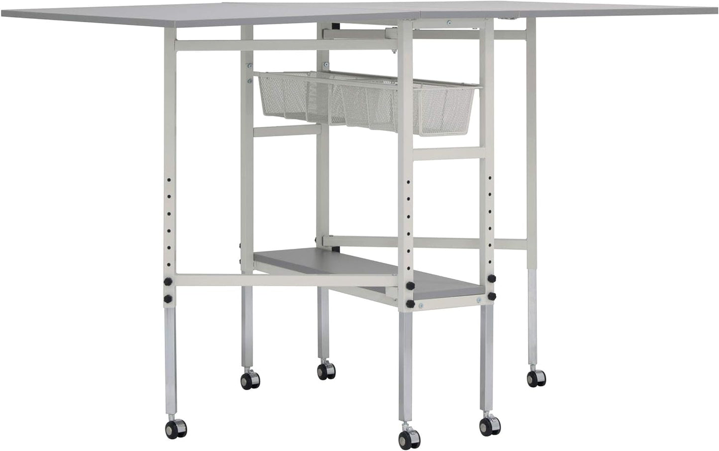 Whether you need a place to cut fabrics, work on crafts, or an extra workspace the Multipurpose Hobby and Craft Table by Sew Ready is the ideal workstation. This hobby and cutting table folds easily and has casters for quick storage when not in use. When fully extended this table offers a work surface that is 60 inches wide and 36 inches deep making it ideal to spread-out, cut or adjust fabric and patterns. Wire mesh drawers and the bottom shelf offer storage for sewing or craft supplies. The table top height can be adjusted from 30.25 inches to 39.25 inches to provide back relief on long projects. Whether you need 1 or 2 table tops, it is easy to get more workspace in seconds. Simply swing out the gatefold leg and secure with the peg underneath the table top, to get that extra work space you need. This Sew Ready Multipurpose Hobby and Craft Table is versatile and great for those with a keen interest in organized workstations.
