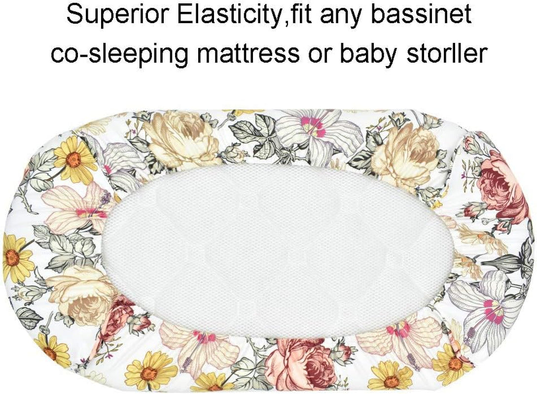 • 💓 Stylish Design & Easy Matching: Our cradle mattress sheet have 5 different floral pattern design ,make the sheet looks super sweet and stylish ,can easy matching various kinds of mattress .Sheets are doubly reinfoced with a thick ,elastic band for security,so you are no need worry about ill-fitting,buched up sheets that are too loose or too tight. What is more it is look super cute and stylish as a background when photographing that sweet baby!