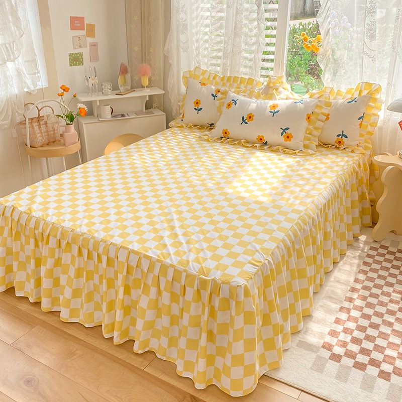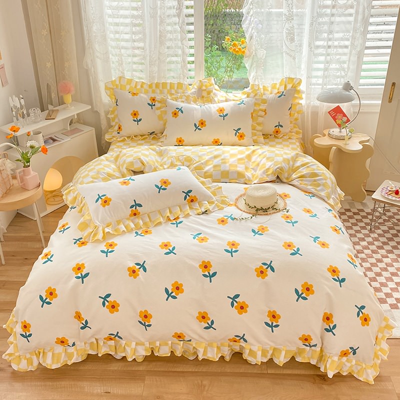 Aesthetic bedding set with cute yellow flowers print on top of duvet and pillows cover and bright yellow checker print on the other side. Lush ruffles and bright colors make it perfect fit for kawaii, kidcore, soft girl and many other aesthetics.