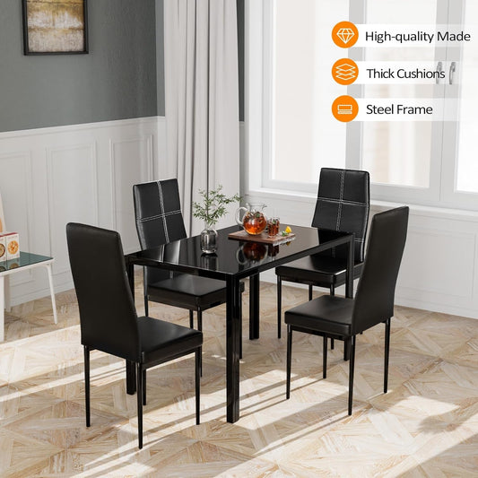 Conjunto de mesa moderna Bonnlo de 5 peças para 4 pessoas, mesa de cozinha e cadeiras para 4 pessoas, mesa de cozinha pequena de vidro preto e cadeiras de couro PU para salas de jantar em espaços pequenos, estrutura de metal, preta