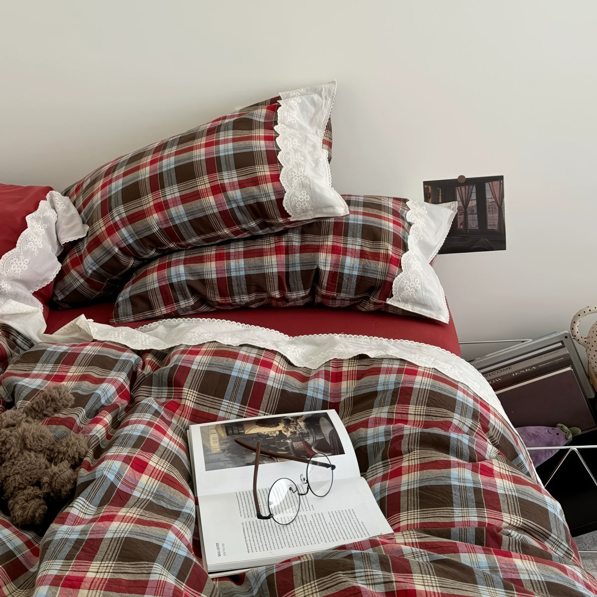 Dieses Bettwäscheset besticht durch ein traditionelles Karomuster in satten Rot-, Braun-, Creme- und Hellblautönen und verleiht Ihrem Raum eine gemütliche, alpenländische Atmosphäre. Bettbezug und Kissenbezüge sind mit zarten weißen Spitzenrüschen verziert, die das kräftige Karomuster mit einem Hauch von Charme abmildern. Die Mischung aus rustikalen Karos und zarter Spitze schafft eine warme, hüttenartige Atmosphäre, perfekt für entspannte Abende. Dieses Set ist auf Komfort und Stil ausgelegt und verwandelt Ihr Schlafzimmer mühelos in einen gemütlichen bayerischen Rückzugsort. Empfohlen für Einrichtungsstile wie Cottagecore, rustikal und Vintage.