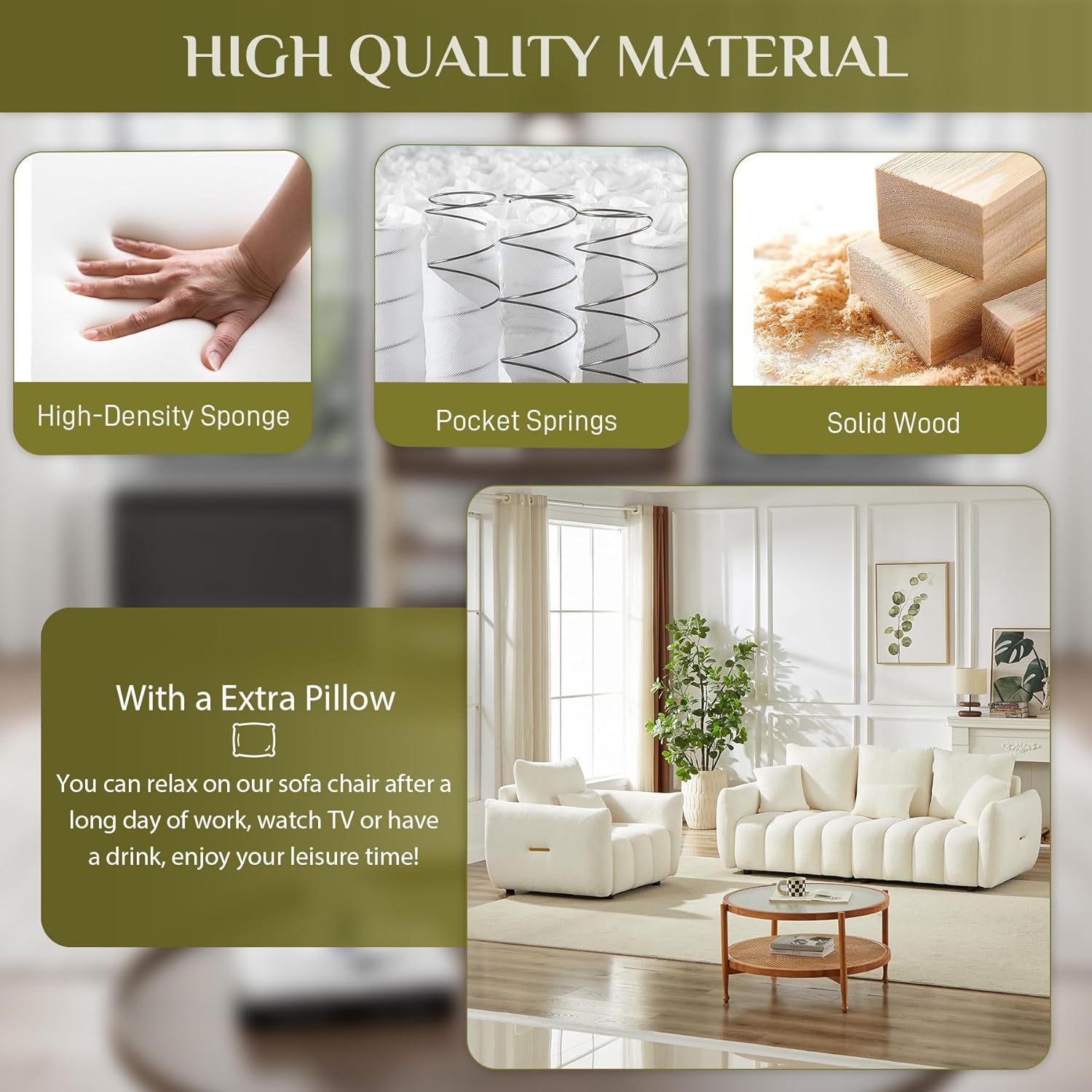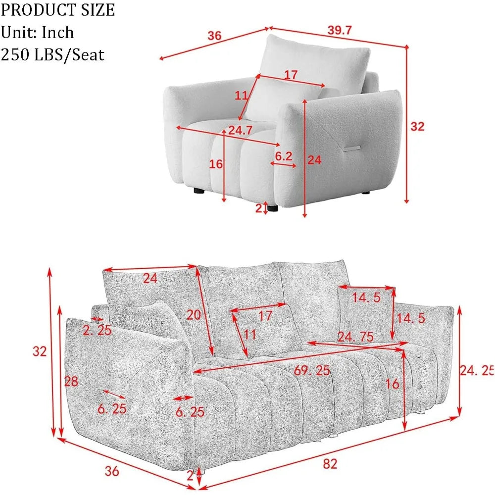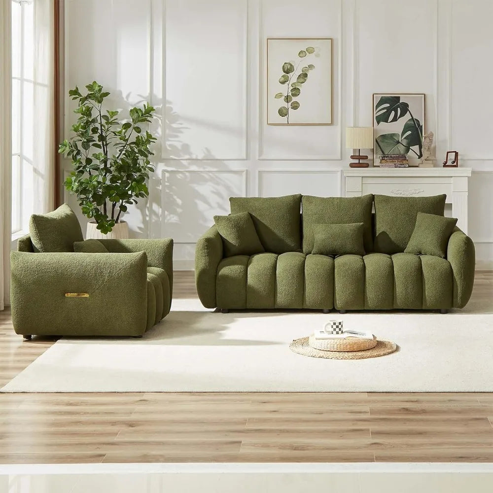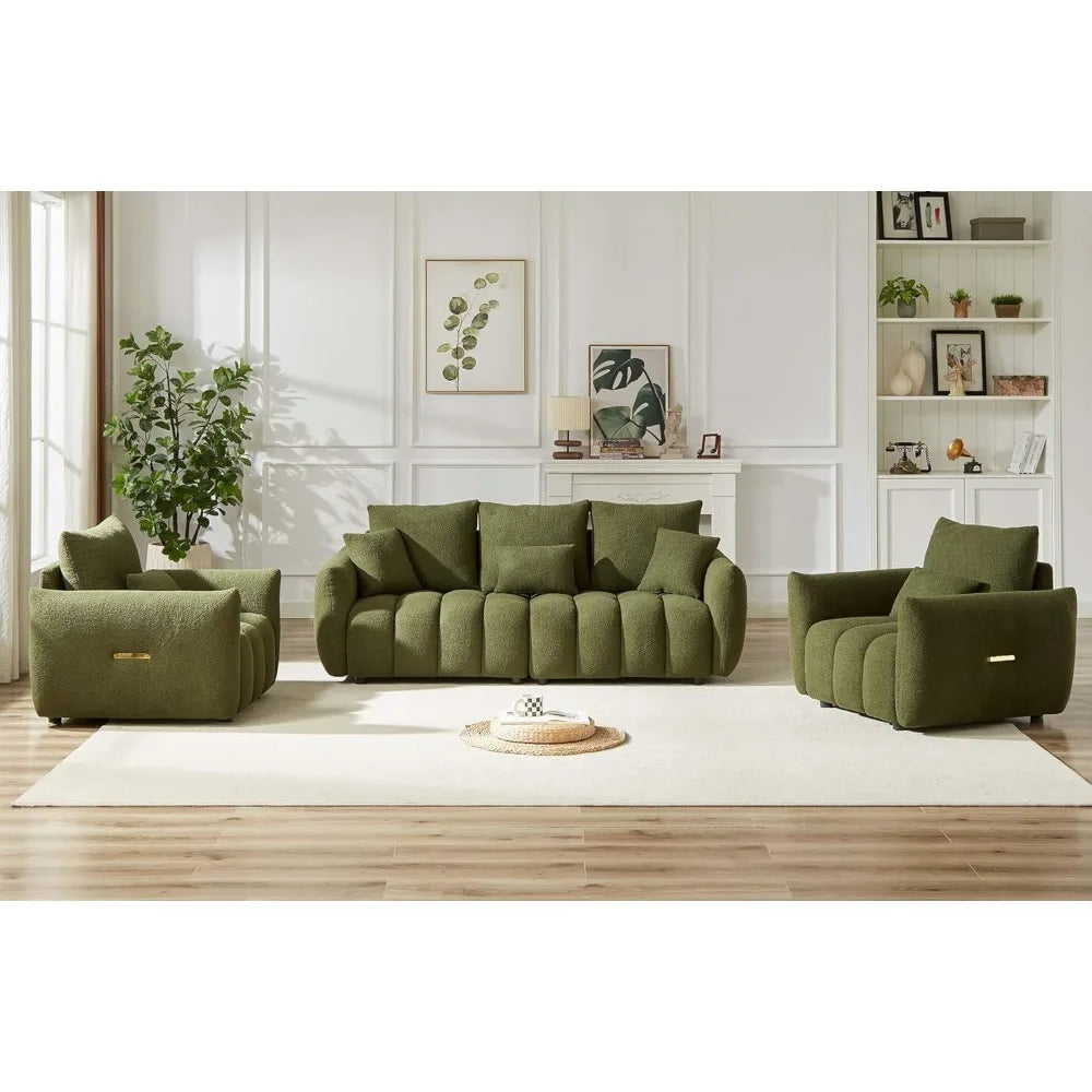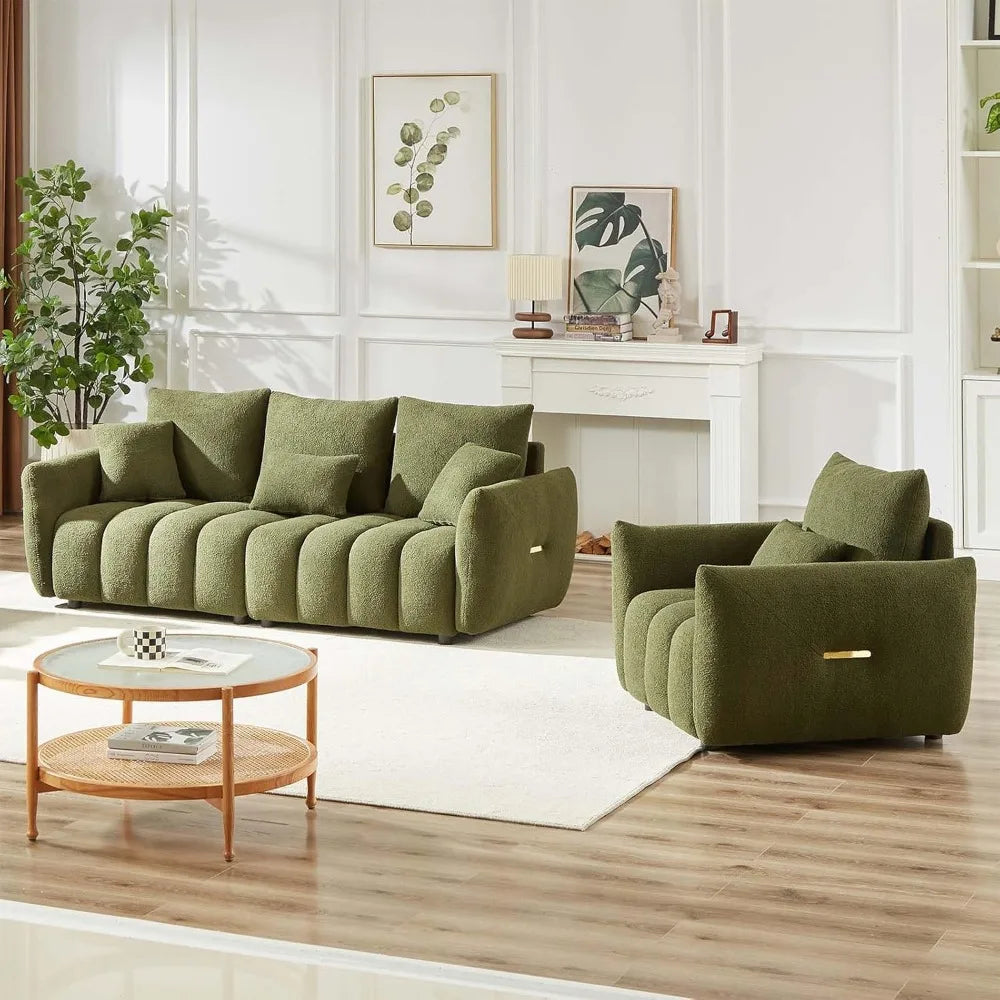 Découvrez l' ensemble de canapés Luma , où confort et modernité se marient dans un vert olive onirique. Revêtu d'un revêtement en peluche ultra-doux et orné d'un capitonnage vertical audacieux, ce duo transforme n'importe quelle pièce en un écrin de sophistication et de confort. Le canapé 3 places aux dimensions généreuses (91 cm de profondeur x 208 cm de largeur x 81 cm de hauteur) invite à de longues séances de détente avec son assise de 175 cm de large, son rembourrage moelleux en éponge et sa capacité de charge totale de 340 kg. Le fauteuil (91 cm de profondeur x 101 cm de largeur x 81 cm de hauteur) est le trône solo ultime avec son assise profonde de 63 cm et sa capacité de charge de 113 kg. Tous deux sont dotés d'accoudoirs légèrement inclinés, de poignées latérales discrètes dorées et de coussins assortis pour un assemblage facile. Fabriqué avec une structure en bois massif et des pieds en plastique résistant, chaque pièce s'assemble en seulement 15 à 20 minutes, sans outils ni stress. Que vous soyez hôte, que vous fassiez une sieste ou que vous vous détendiez simplement, Luma vous offre un luxe décontracté avec une touche de style. (P.-S. : Toutes les mesures sont manuelles et peuvent présenter de légères variations ; les couleurs réelles peuvent légèrement différer en raison de l'éclairage ou des réglages de l'écran.)