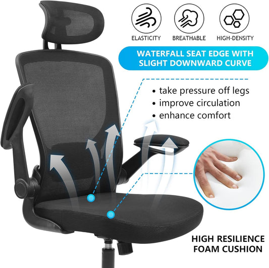 Cadeira de escritório ergonômica KERDOM, cadeira de mesa de malha respirável, cadeira de computador com apoio lombar com apoio de cabeça e braços rebatíveis, cadeira de trabalho giratória, cadeira de jogos de altura ajustável