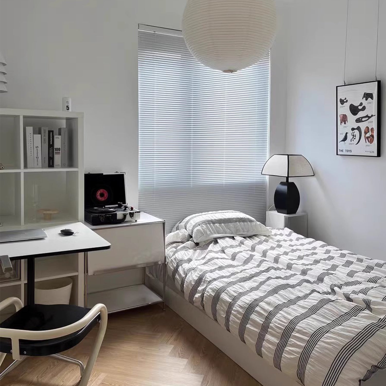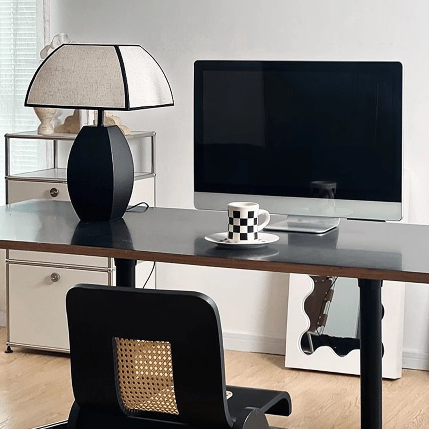 Make a captivating statement with our table lamp, featuring a large white lampshade adorned with sleek black trims, creating a striking contrast that exudes sophistication. The versatile style of this lamp allows it to seamlessly complement a wide range of interior aesthetics, from classic Victorian to modern minimalistic. Resting on a sleek black base, it not only adds a touch of glamour but also ensures stability and durability. Illuminate your bedroom, living room, or home office with the perfect blend of vintage charm and modern flair.
